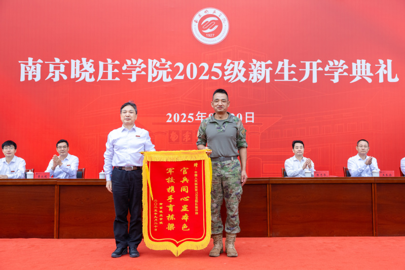 典礼现场,校党委书记张策华向承训部队赠送锦旗,向部队官兵的辛勤付出致以诚挚感谢。校领导分别为2025级新生军事训练工作先进集体与优秀个人颁奖,并为新生代表佩戴校徽,殷切勉励他们传承行知精神,在晓庄续写新的荣光。
