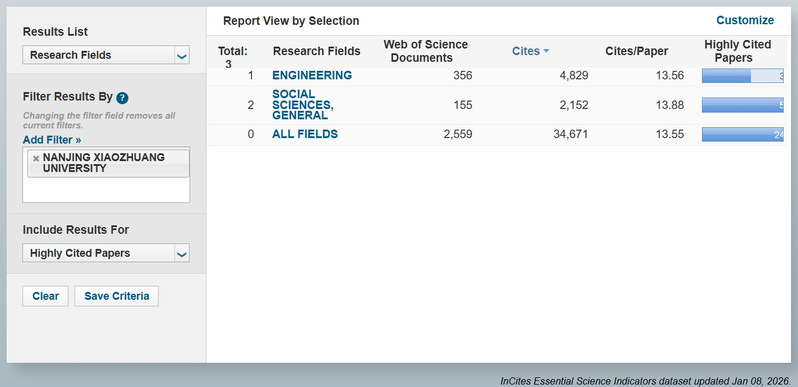 1月8日,科睿唯安(Clarivate Analytics)公布了基于科学指标数据库(Essential Science Indicators,简称ESI)的最新数据,我校社会科学(Social Sciences, general)学科首次进入ESI全球前1%。至此,我校已有工程学、社会科学两个学科进入ESI全球排名前1%,学科建设取得重大进展。